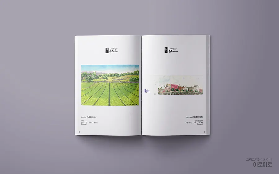 그림이 들어가는 페이지들은 디자인적인 요소를 최소화하고 그림이 돋보이도록 디자인하였고, 색 표현이 자연스러운 랑데뷰 고급지를 사용하여 인쇄 시 원화의 느낌을 최대한 표현하였습니다.